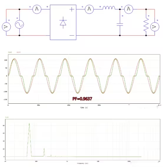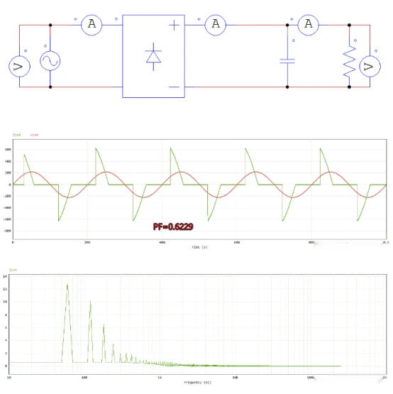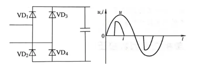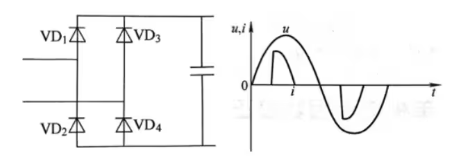 图为二极管不可控容性整流电路,具有结构接单,成本低,可靠性高的特点,但其致命缺点是输入电流并非正弦波,而是位于电压峰值附近的脉冲。主要原因在于二极管整流电路并不具备对输入电流的可控性。由于二极管具有0.7V左右的导通电压,当电源电压高于导通电压时,二极管导通;当电源电压低于导通电压时,二极管关断,输入电流为零,这样就形成了电源电压峰值附近的电流脉冲。这样严重失真的电流波形不仅降低了供电的效率,还会导致交流电压产生畸变并产生多次谐波,从而影响电网中其他用电器的正常工作。