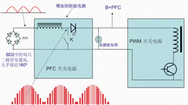 对这一现象的解决办法就是对电流脉冲的幅值进行抑制,使电流波形尽量接近正弦波,这一技术便称为功率因数矫正PFC(Power Factor Correction)。使用PFC电路可以提高电源系统功率因数,降低电流波形的失真。