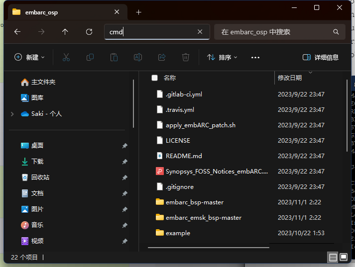 1.在embARC OSP 软件包安装目录下打开命令提示符。打开方式:在资源管理器地址栏输入cmd并按下回车。
