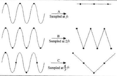 所定的取样频率若取样的频率太低,就会产生取样的结果和原来的样本不同的状况。若一样本的频谱是带限频谱,也就是在某一频率|Wn|之外都为0的频谱,那么取样频率Ws就必须要大于两倍的Wn ,才不至于使频谱产生交叠,也因此产生失真。即:采样率需至少高于信号最高频率两倍 Ws>2Wn