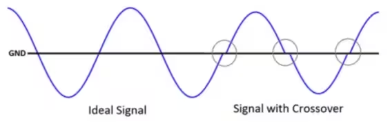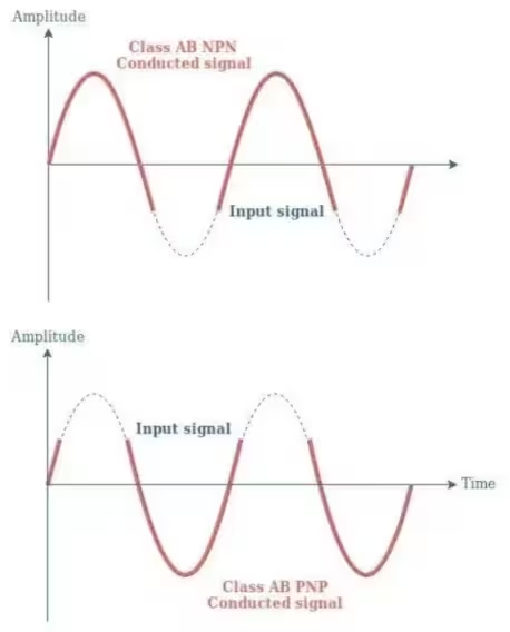 推挽式放大器。正弦信号的正负两个半周分别由推挽输出级的两个晶体管轮流放大输出,每一晶体管的导电时间为信号的半个周期,两个输出放大器一开一关之间,会导致正负波交点的线性不连续,产生交越失真,使得声音变得粗糙。通过模拟电路的调整可以将该失真尽量的减小甚至消失。但在信号非常低时失真仍十分严重。效率明显高于A类功放(平均约为75%),且产生的热量低。
