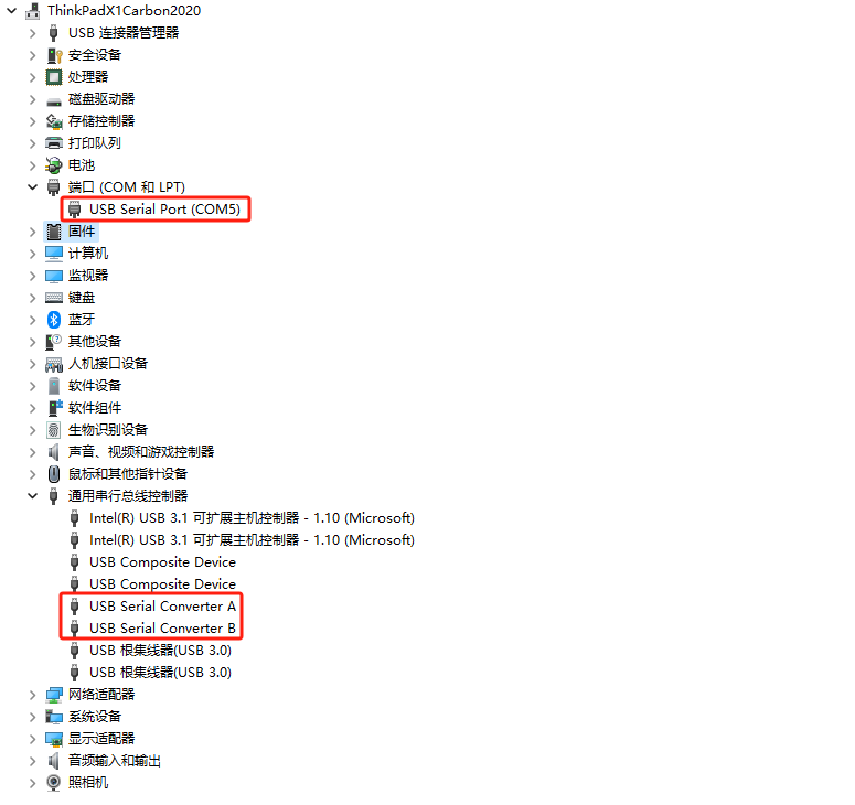 测试:开发板连接到电脑后,设备管理器出现设备信息:一个串行端口USB Serial Port和两个串行总线端口USB Serial Converter A/B