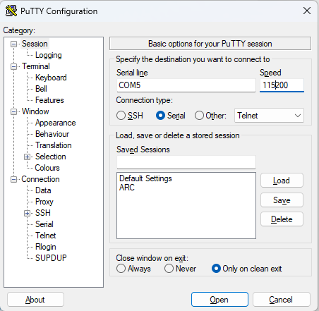 下载 Tera TermPuTTY ,选择Serial连接,serial line填写设备管理器中的设备COM号,在设置中选择115200波特、8位、1个停止位、无奇偶校验(115200-8-N-1)