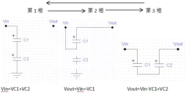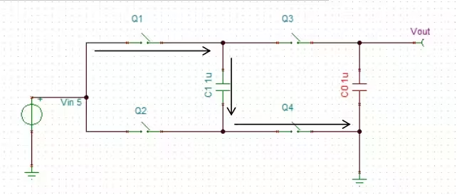 在转换阶段,Q1Q4关断,Q2Q3导通,由于电容两端电压不会突变,Vout=Vin+VC1=2Vin