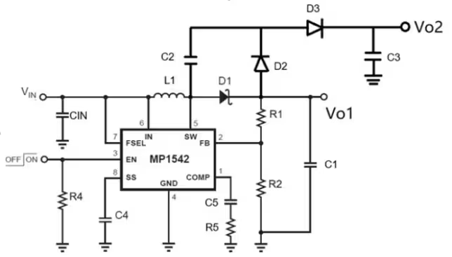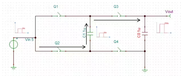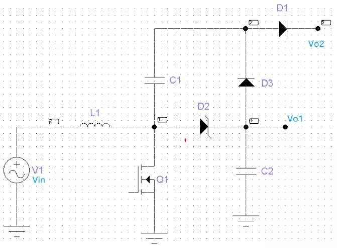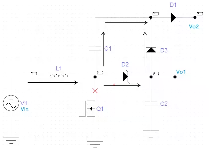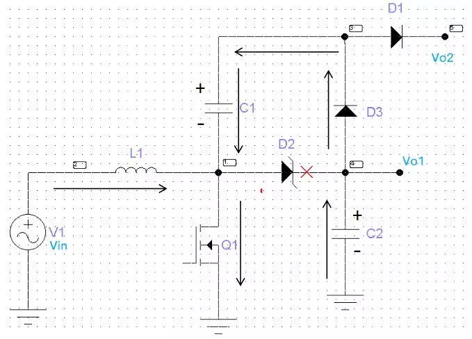 Q1 关断时,电容 C1 开始向输出传递能量,这样 C1电容便充当了电荷的搬运工,实现了 VO2=VC1+VO1=2VO1