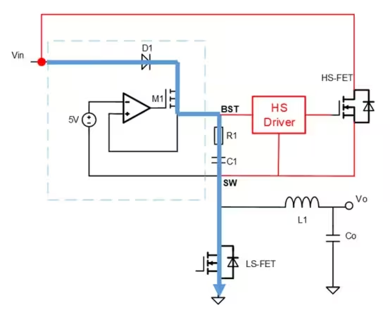 ▲在Buck电路中,为了驱动上管,需要额外输入一个VBias或内置一个自举电路抬升栅压以满足VGS>VTH。下图电路中的C1就是用于抬升gate电压。