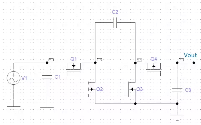 电荷泵最经典的应用是倍压输出,主要利用了电容储存电荷的原理组成不同的充放电回路以拉高输出电压。基本结构如下图:
