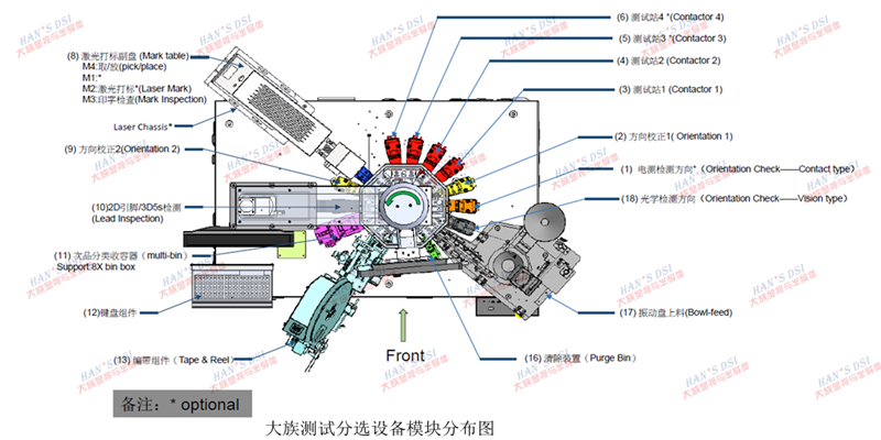 分选机:具有承载待测品进行测试的自动化机械结构,其内有机械机构将待测品一颗颗从标准容器内自动的送到测试机台的测试头(Test Head)上接受测试,测试的结果传回分选机,而后分选机依其每颗待测品的电性测试结果来作分类(此即产品分Bin)的过程。