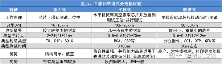 根据传输方式不同,半导体分选机分为平移式、转塔式、重力式等类型。重力式分选机结构简单,投资小;平移式适用范围广、测试时间较长或先进封装情况下优势明显;转塔式适合体积小、重量小、测试时间短的芯片。