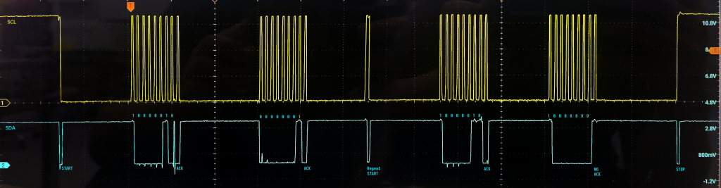 如下图逻辑分析仪的采样结果:释放总线后,如果没有应答信号,sda应该一直持续为高电平,但是如图中蓝色虚线部分所示,它被拉低为低电平,证明收到了应答信号。