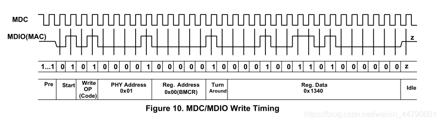 在 MAC 直接发送总线上的数据(Reg Data),到指定的外部芯片地址 PHY Address 中的指定寄存器(Reg Address)中。