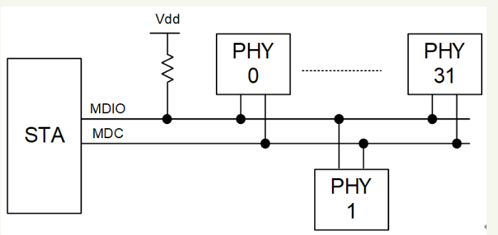 STA(Station Management)为主控设备,比如 MCU、MAC、ONU 等。PHY 为从设备。一个 STA 最多管理 32 个 PHY。MDC 信号由 STA 控制,MDIO 信号根据通信方式的不同可以由 STA 或者 PHY 接管控制。通常 MDIO 会通过电阻上拉至接口电源。
