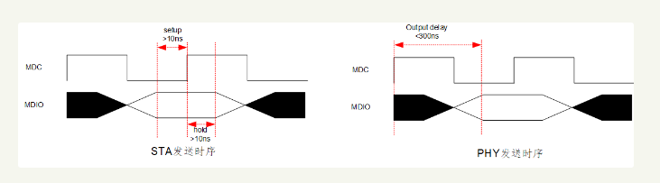 MDIO 接口包括两条线,MDIO 和 MDC,其中 MDIO 是双向数据线,而 MDC 是由 STA 驱动的时钟线。
