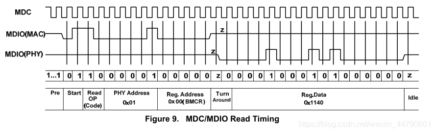 通过 MAC 发送 PHY Address(芯片地址)及 Reg Address(芯片上寄存器的地址)来驱动 PHY 芯片,读取 PHY 芯片的这个指定地址上的值(即 Reg Data 部分),然后释放总线。