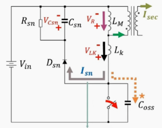 当MOSFET关断时,Lk电流保持初始方向,忽略流向Coss的电流,假设全部电流流向Csn,相当于电感器与电压源串联,为电容器充电。