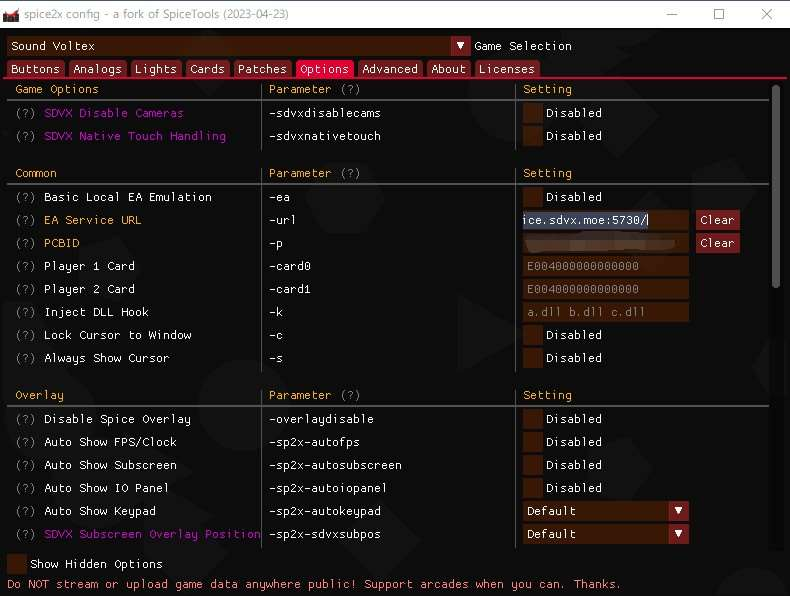 在游戏文件目录下寻找 spicecfg.exe,双击打开。在图示页面中 EA Service URL 填写 http://rice.sdvx.moe:5730/ 在 PCBID 栏填上你的 PCBID 。本网不对其进行限制,相同的 PCBID 视作一个店铺,可 以查看店铺排名。