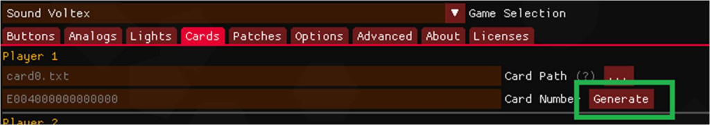 点击 Cards 选项卡,填写你的 E004/012E 卡号或者点击 Player 1 的 Generate 生成一个 卡号,并记录下来。以后可以用此卡号注册 WebUI 账号和找回数据。WebUI 网址见文末。